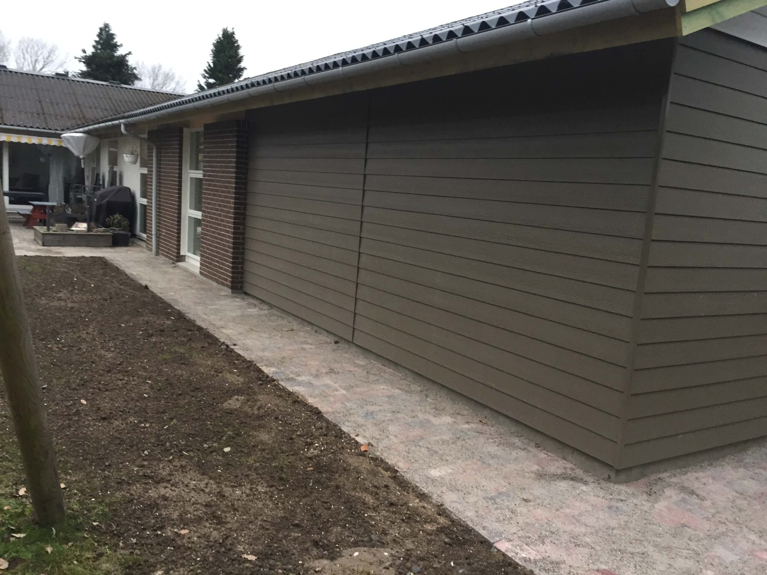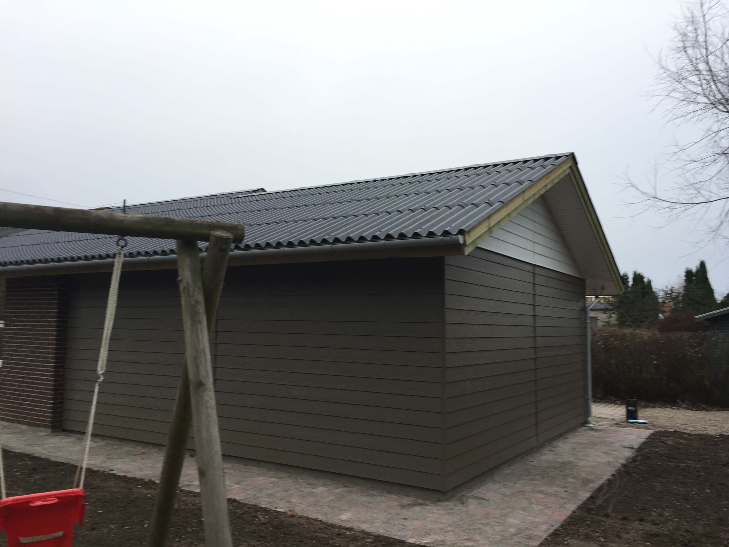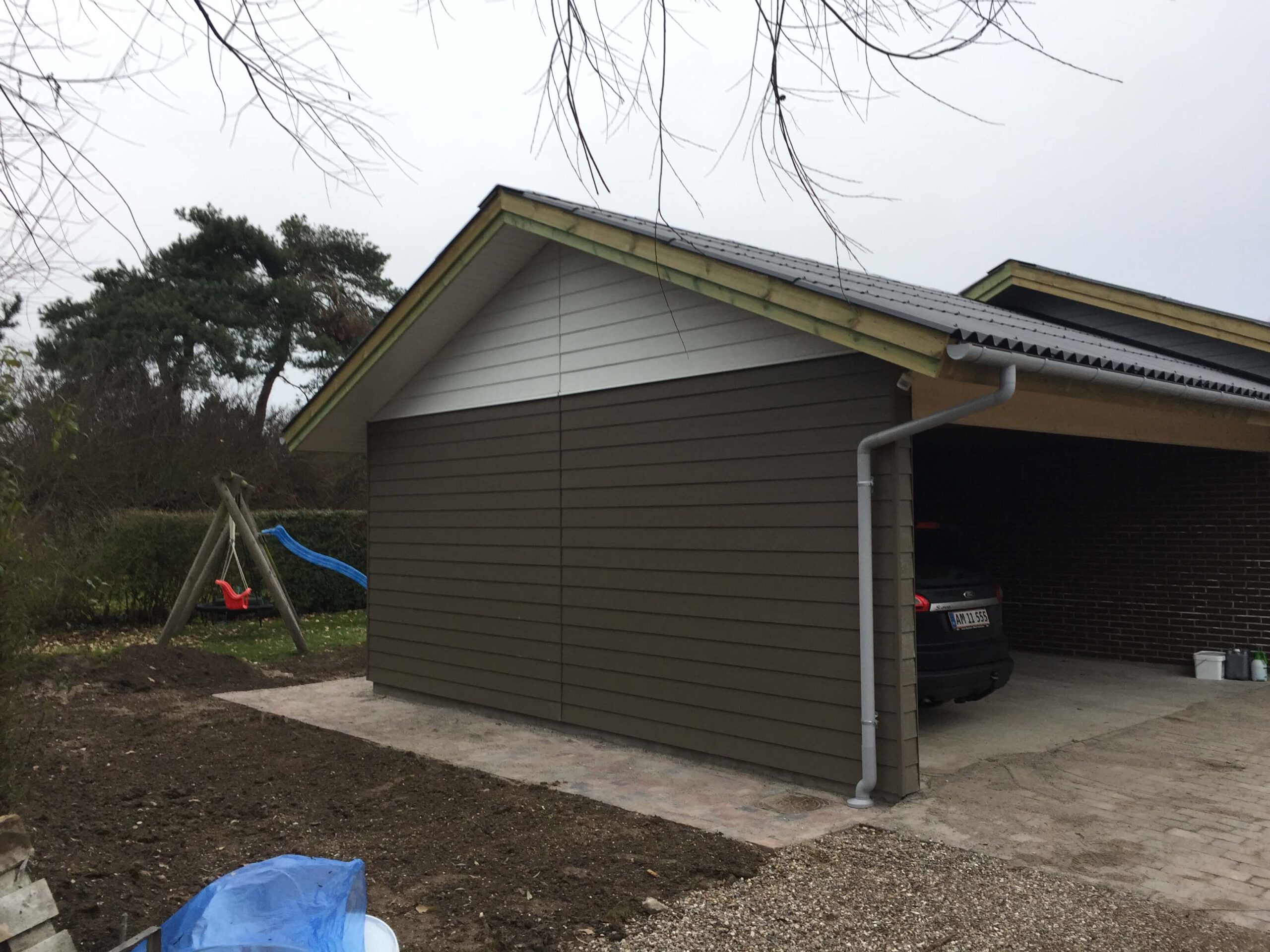 Dobbeltgarage sammenbygget med eksisterende bolig i Greve, udført med materialer og taghældning, der matcher huset. En praktisk og velintegreret løsning med fokus på funktionalitet og et harmonisk helhedsudtryk.